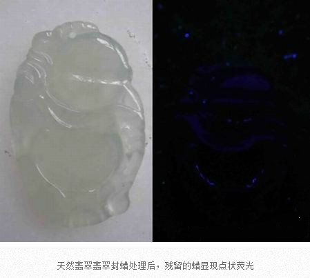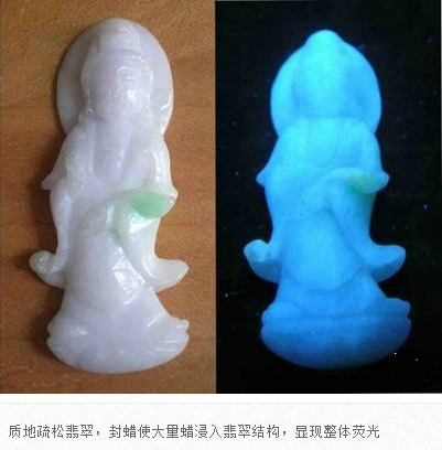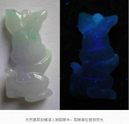 翡翠成品在雕刻成為毛坯后,在拋光前,都會進行封蠟處理,封蠟后可使蠟在拋光后進入翡翠表面存在的微細凹坑或裂隙中,填補其不平,使翡翠顯得更加圓潤,增加其光亮程度亮,還可防止油漬的進入。當(dāng)然,封蠟的最主要的目的就是為了掩蓋裂紋。由于有蠟存在于翡翠中,在紫外熒光燈下會產(chǎn)生明顯紫外熒光。
